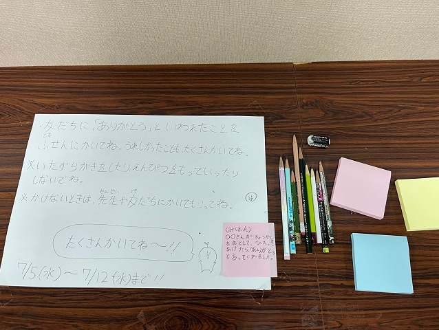 児童会では、6月27日に開催された「いじめ・非行防止合同サミット」での意見交換での内容を受けて、全校児童で感謝の気持ちの分かち合い、お互いを尊重し合う機運を高める取組「ありがとうの木」を7月5日~12日に実施しました。(写真は7月6日に撮影)