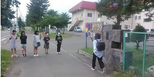 児童会では、学校全体のコミュニケーション の活性化を図り、豊かな人間関係と住みよい学校の生活環境を築くことを目的として「あいさつ運動」に取り組んでいます。朝、正門で登校してくる児童に笑顔で「おはようございます!」と声をかけています。