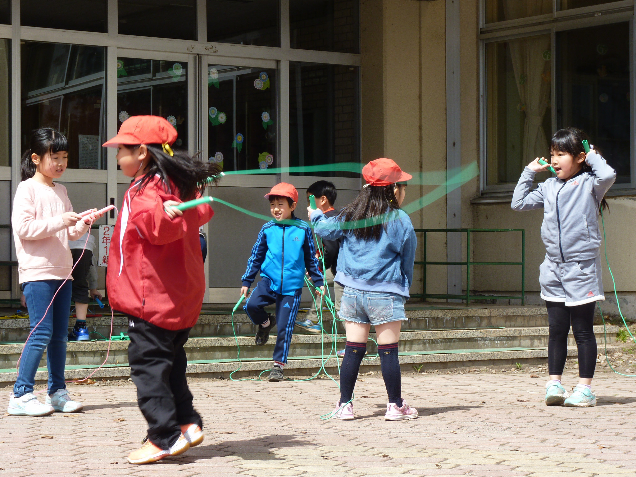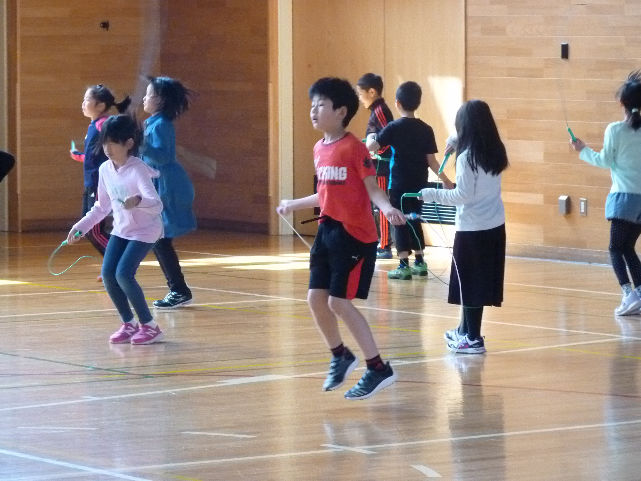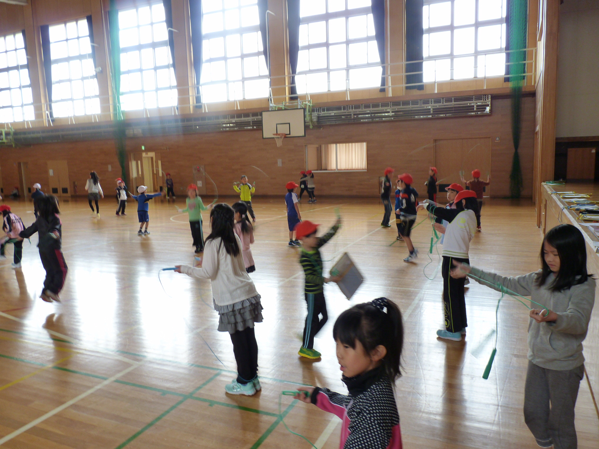 『なわとびがんばりカード』という取り組みがあります。これは、休み時間になわとびを跳んで、跳んだ回数に応じて『なわとびがんばりカード』にシールがもらえるというものです。なわとびは手軽に始められる運動ということもあってか、体育館や外などで多くの児童が楽しそうになわとびを跳んでいます。