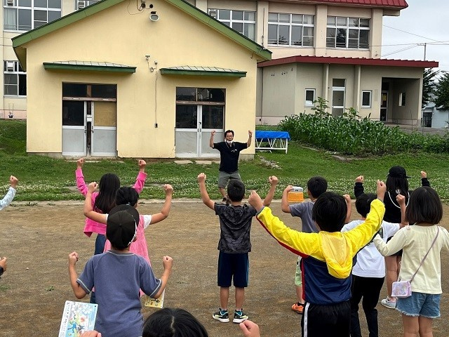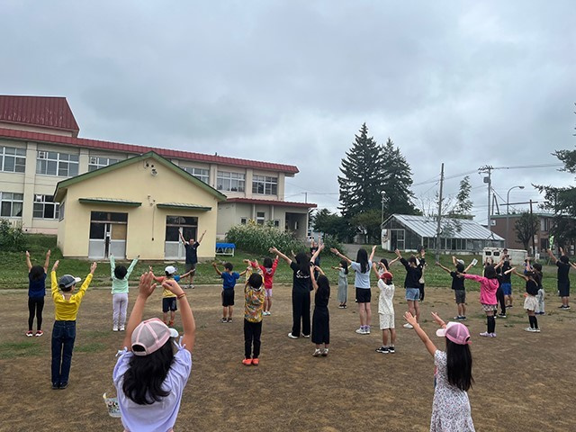 本校の体力向上の取組の一環として、コミュニティ・スクール協議会とPTAが共催で子供たちに体を動かす心地よさを感じさせるとともに、規則正しい生活習慣を身に付けさせようと、夏休み中に「北栄小夏休みラジオたいそうの集い」を開催しています。