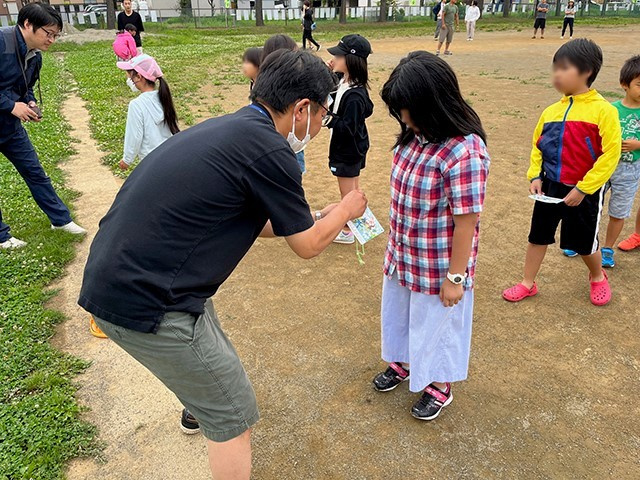 朝7時にグラウンドに集まった子供たちや保護者は、ラジオ体操のリズムに合わせて体を動かします。体操が終わった後、子供たちはラジオ体操カードにスタンプを押してもらいます。